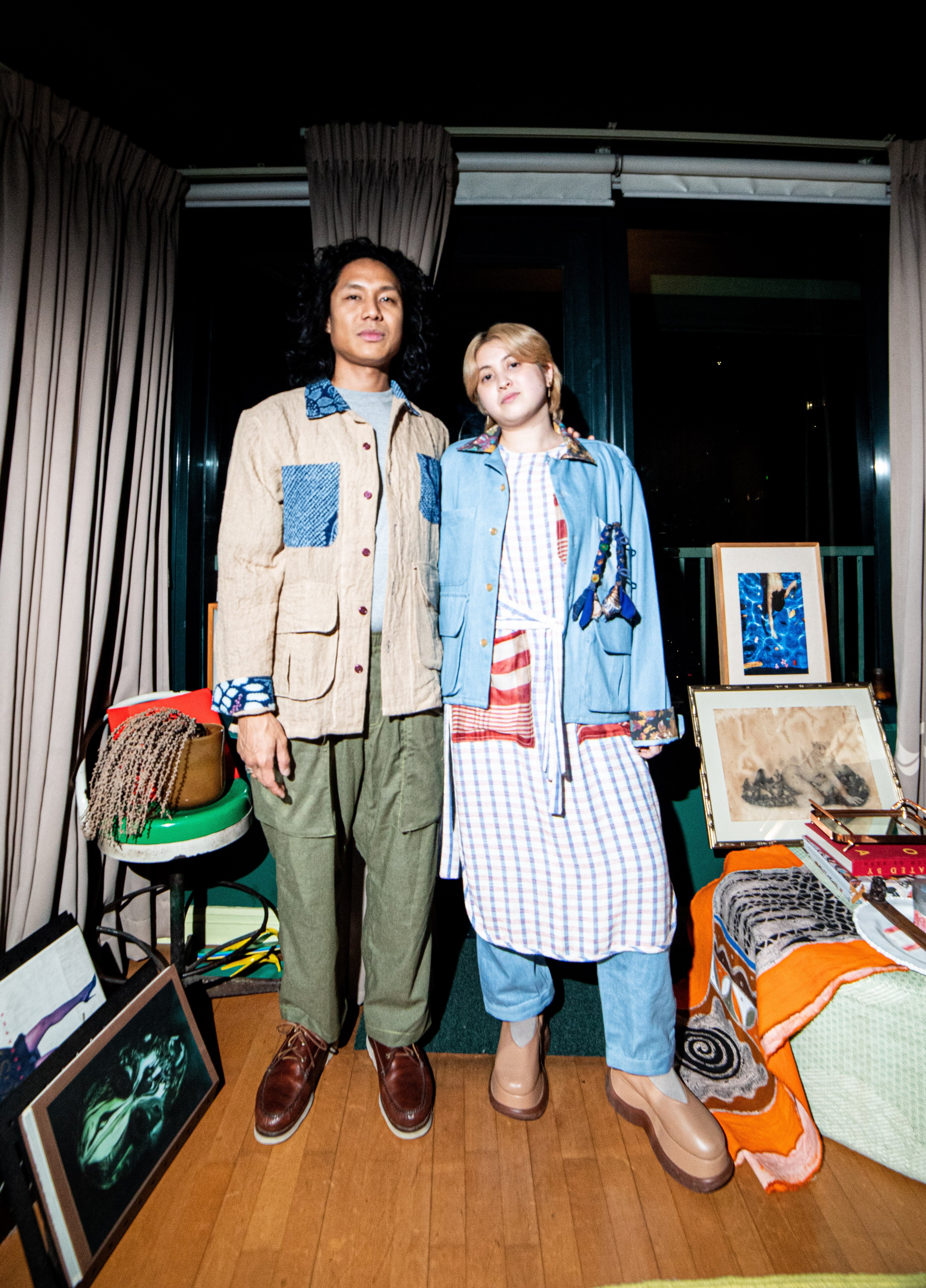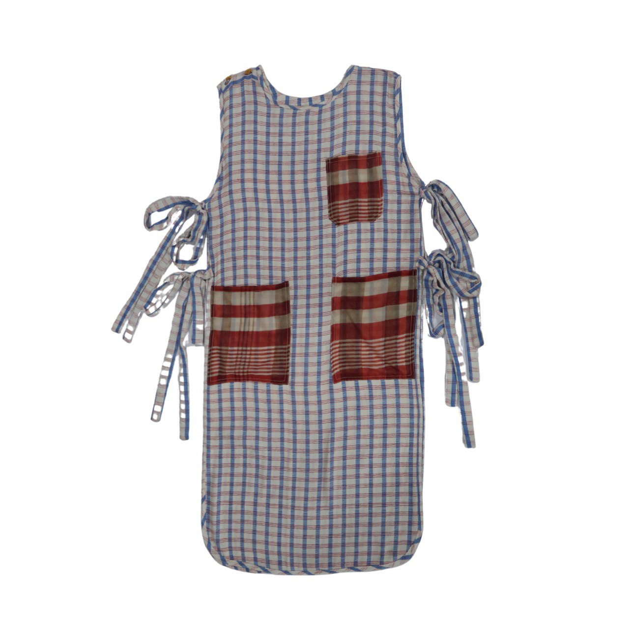 The Bib is a mid layer piece we've made as a means to add accent to an outfit, or to use on its own. Built here in an exaggerated length in a super soft beach plaid, with three rayon chiffon checkered pockets on the front, and self ties to adjust fit and form.