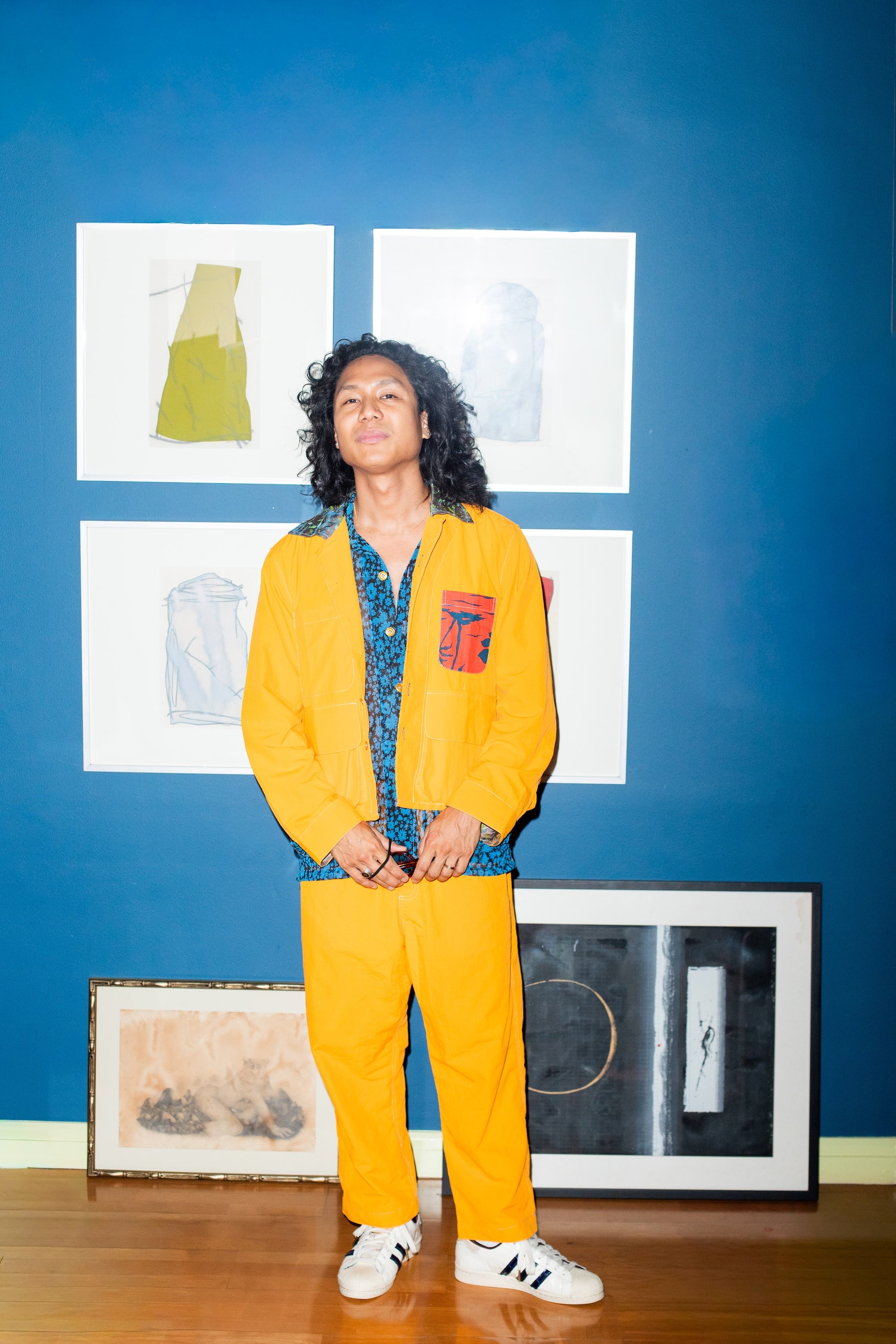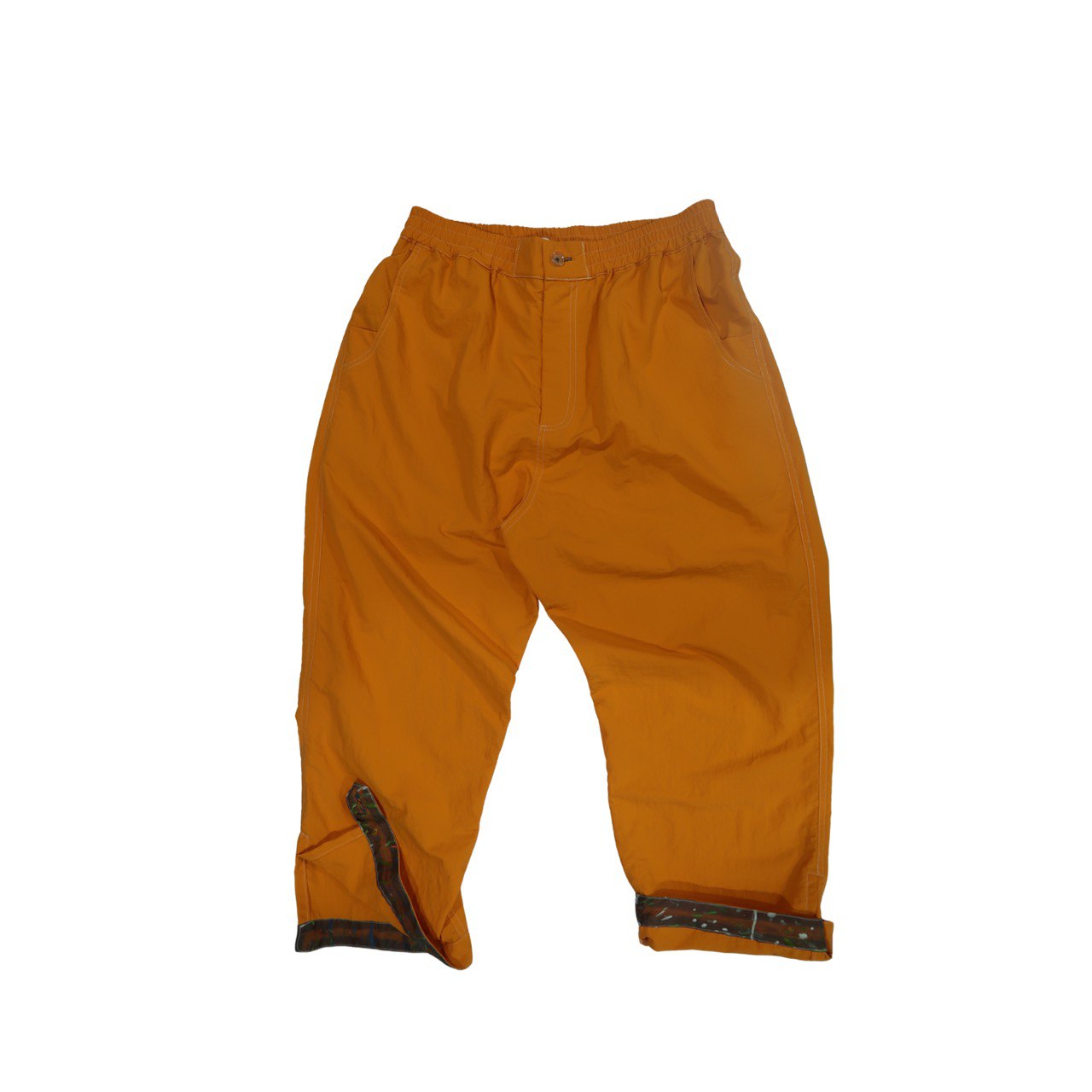 - Matching paint spattered raw silk lining at the button cuff leg opening.